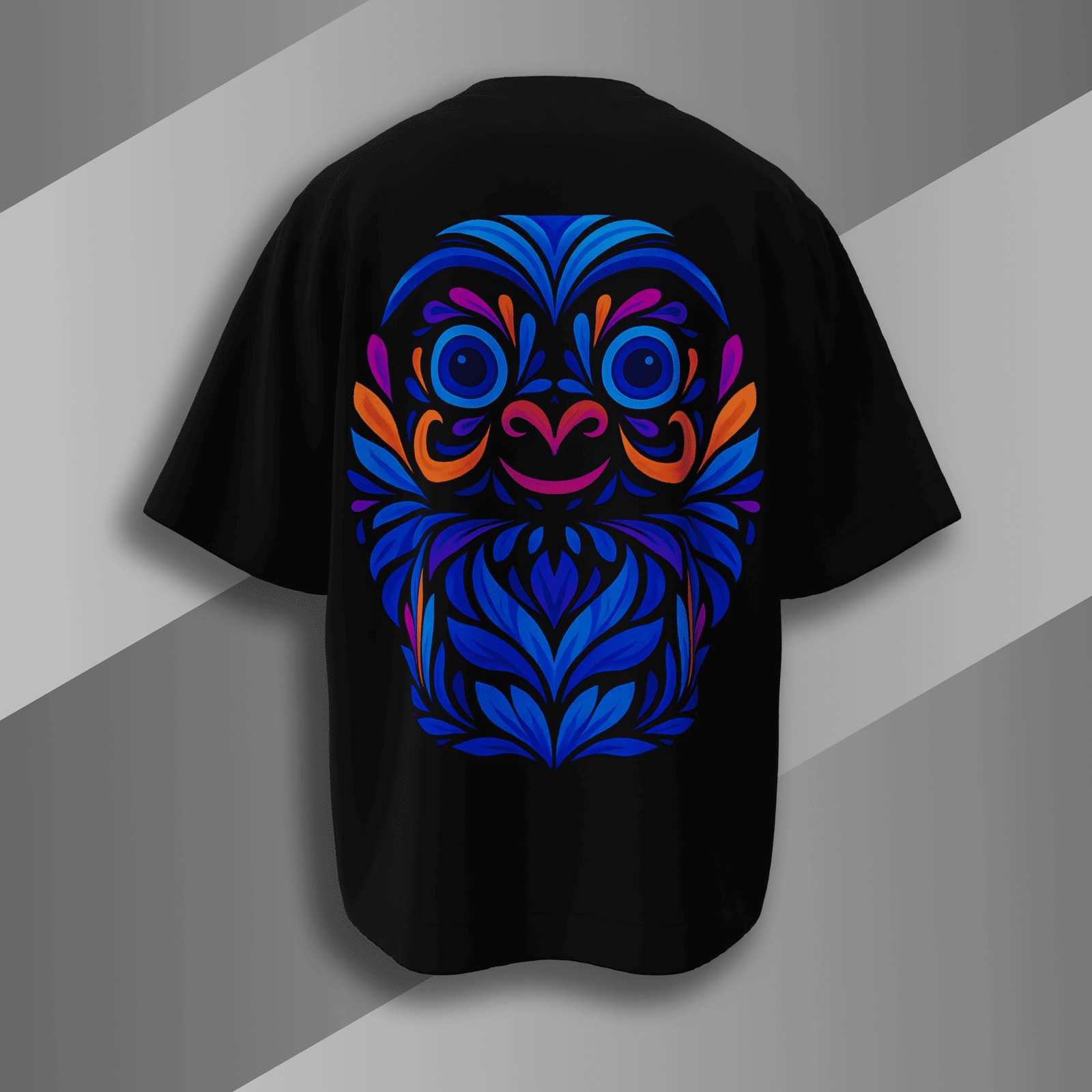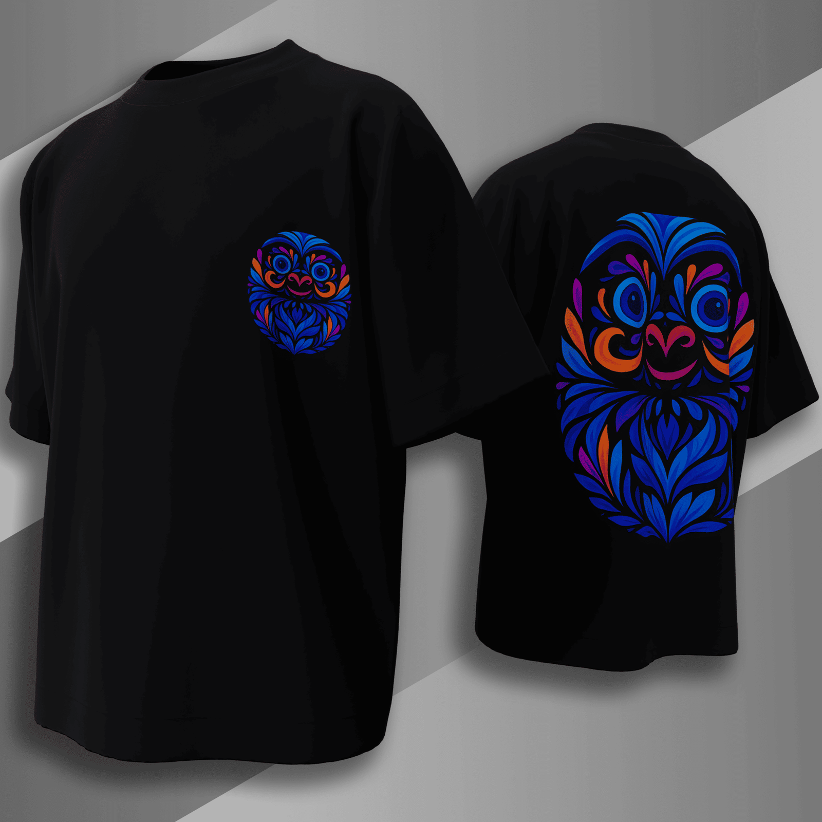 Step into a world of inspiration and style with our oversized black T-shirt, designed not just as clothing but as a statement. Featuring a striking Daruma doll graphic on the back, this T-shirt embodies the essence of resilience and determination. Drawing upon vibrant shades of blue, purple, and orange, it transforms the traditional Japanese symbol into a bold piece of art that speaks volumes.