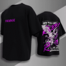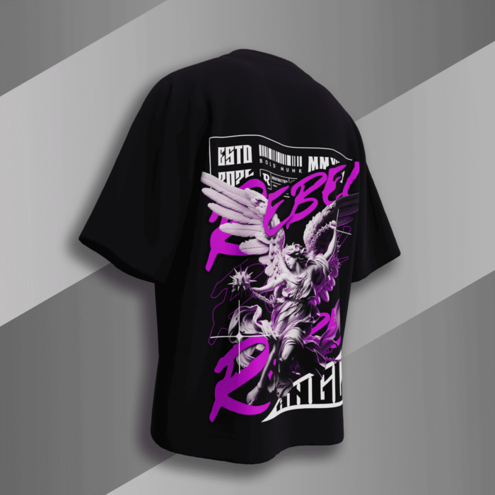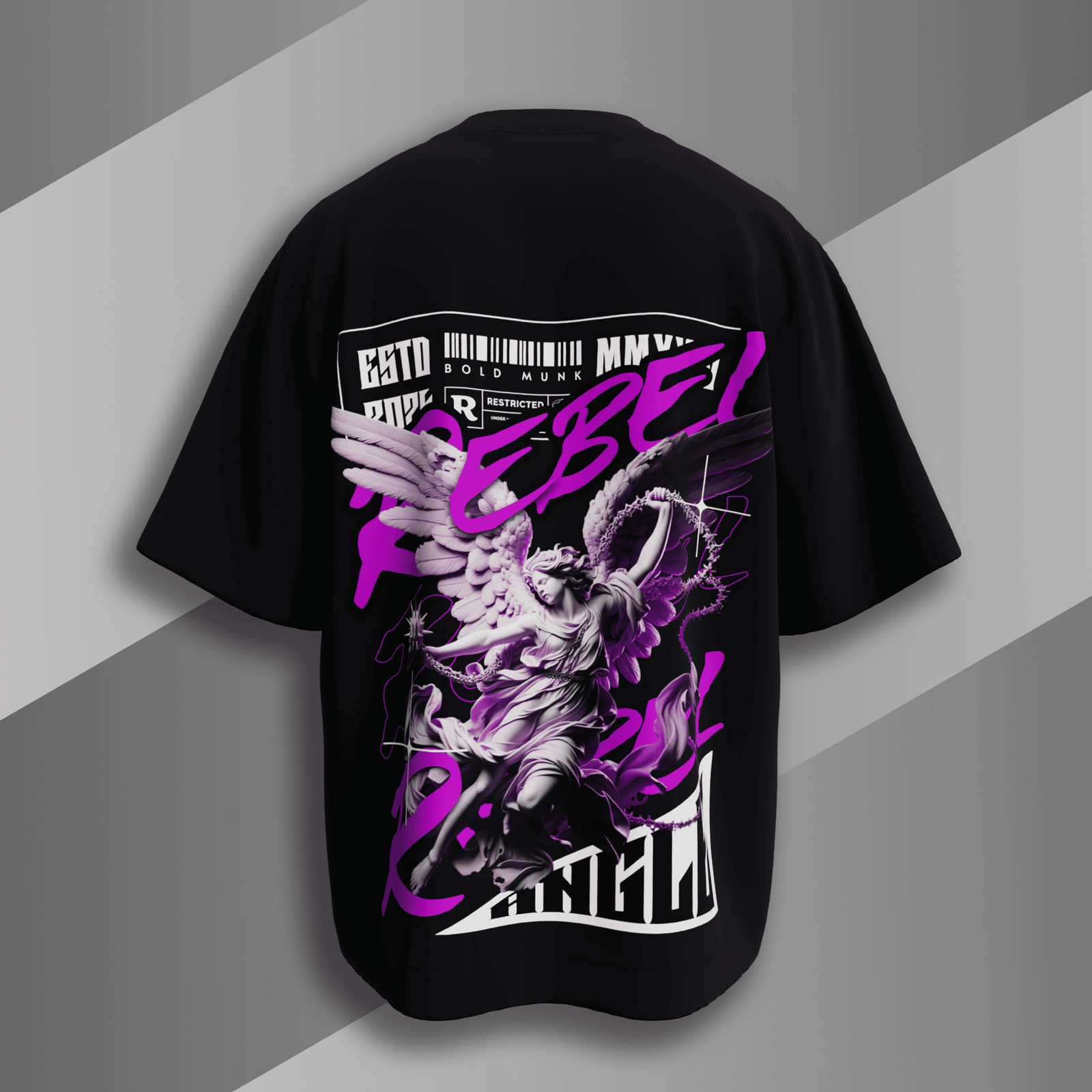 The back of the t-shirt is where the design truly comes alive. Featuring an eye-catching graphic of a winged figure, this artwork is an artistic representation of rebellion, strength, and the pursuit of freedom. The vibrant purple accents complement the overall aesthetic, drawing attention and admiration from onlookers. Framed by geometrical shapes and bold text, this dynamic combination creates a contemporary vibe that speaks to the essence of modern streetwear culture.